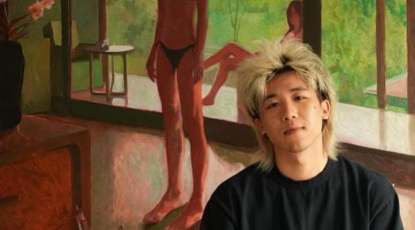 Technically, this body of work pushes Huang’s practice further. His signature “permanent rose” underpainting still radiates through the scenes, like an inner light, but the surface has grown denser and more physical, with thick layers of paint scratched back into “waterfall” textures where colours bleed into one another.