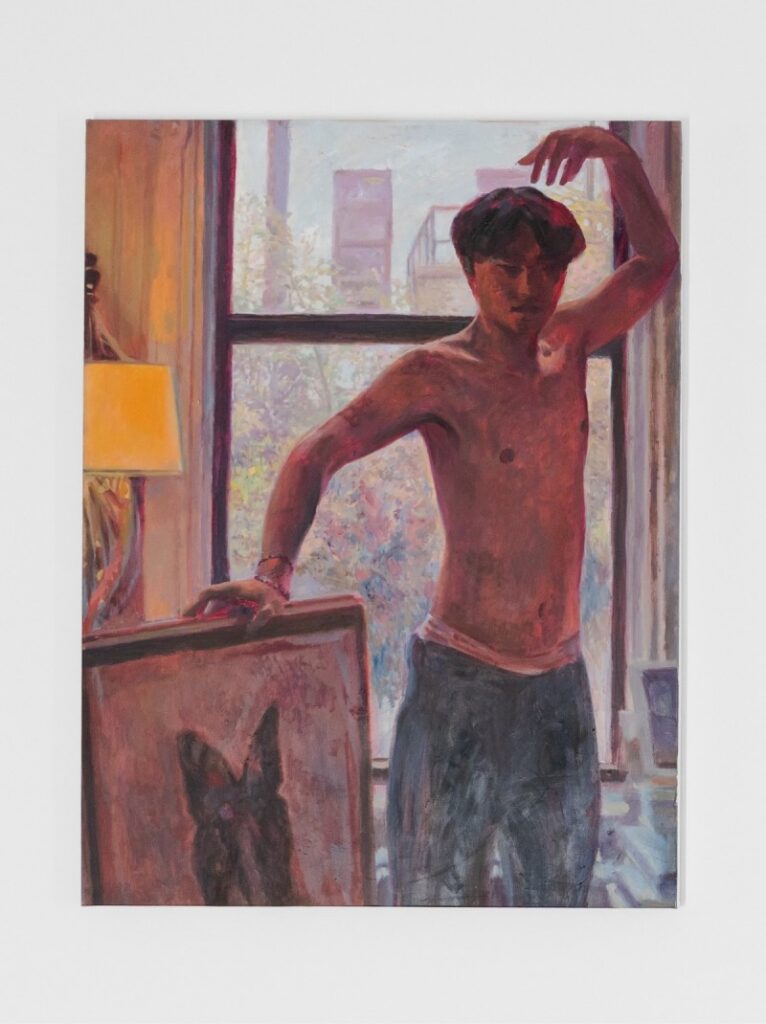 Living with colour‑vision deficiency, Huang leans into an instinctive palette of reds, browns and deep blues that anchors the work in a grounded, almost tactile sensuality. These interiors are not mere backdrops; they act as psychological extensions of the studio, fortified spaces for queer desire and community that echo Herbert Tobias’s photographs, Pierre Bonnard’s interior light, David Hockney’s compositions and the figurative language of his mentor T.M. Davy.