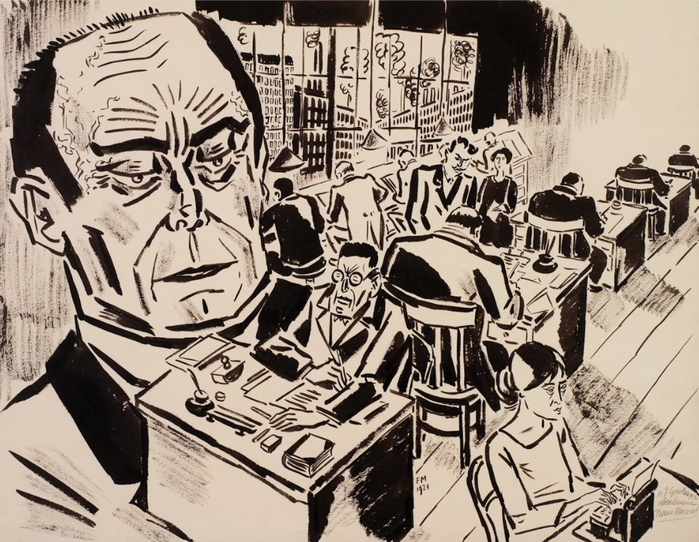 Frans Masereel, Au bureau, 1924, encre de Chine sur papier, 49,5 x 64,2 cm., photo Bernard Babette – Dries Van den Brande, © SABAM Belgium, 2026, Collection privée.
