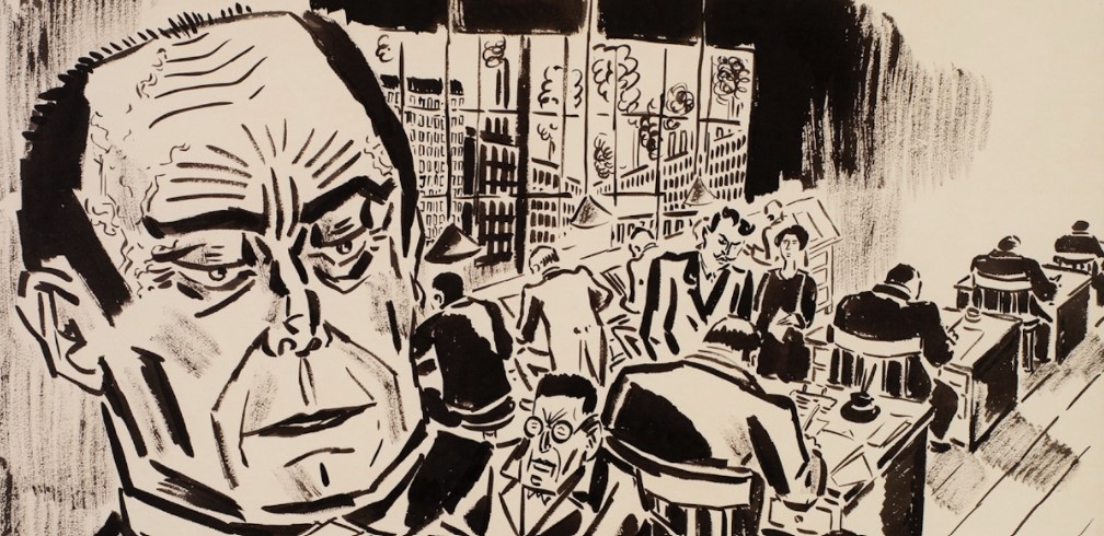 Frans Masereel, Au bureau, 1924, encre de Chine sur papier, 49,5 x 64,2 cm., photo Bernard Babette – Dries Van den Brande, © SABAM Belgium, 2026, Collection privée.